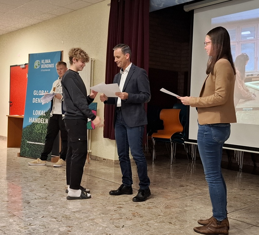Als Anerkennung für ihren engagierten Einsatz im Klimaschutz erhielten die Schüler:innen abschließend eine Urkunde, überreicht von Frau Rita Ovari und Bürgermeister Wolfgang Dolesch.