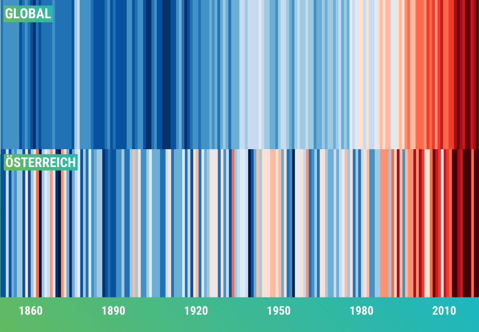 Der Klimawandel ist eine der größten globalen Herausforderungen unserer Zeit. Die beiden Klimastreifen verdeutlichen die Dimensionen der globalen Erwärmung sowohl auf regionaler als auch globaler Ebene. Während die Temperaturabweichungen in Österreich lokale Folgen des Klimawandels verdeutlichen, macht der weltweite Anstieg der Temperaturabweichungen die beschleunigte Erwärmung der letzten 150 Jahre sichtbar. Sie zeigen, dass der Klimawandel unser Leben und unsere Lebensräume bereits heute spürbar verändert.