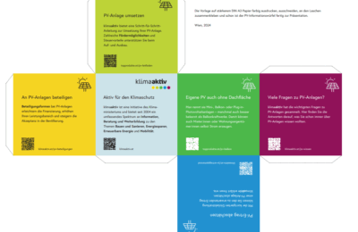 Mit kreativen Give-Aways wie unserem Photovoltaik-Würfel unterstützen wir die Kommunikation von wichtigen Infos zur Energiewende. Auf unserem Kartonwürfel sind Links zu Antworten auf häufig gestellte Fragen zum Photovoltaik-Ausbau sowie wichtigsten Anleitungen für ihr eigenes Photovoltaik-Projekt abgedruckt. Damit ist unser Kartonwürfel ein praktisches Give-Away zum Selbstdrucken, welcher auf seinen sechs Seiten jeweils ein spannendes Thema rund um Photovoltaik präsentiert. ob auf Ihrem Schreibtisch oder auf Veranstaltungen – der Würfel ist immer ein Hingucker.