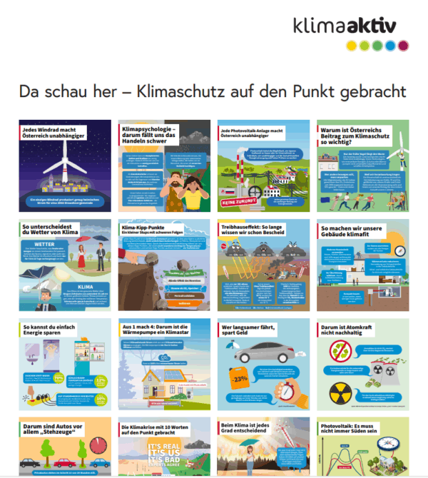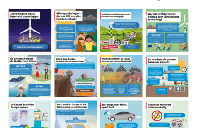 Ein Bild sagt mehr als 1000 Worte, klimaaktiv Infografiken erklären, helfen beim Einordnen, geben praktische Tipps und kontern Falschinformationen. Bisher konnten diese nur digital verbreitet werden. Jetzt gibt es die ersten 16 klimaaktiv Infografiken als Poster zu bestellen – für Klassenzimmer, Gemeindezentren, Rathäuser, Vereinslokale und andere öffentliche Räume.